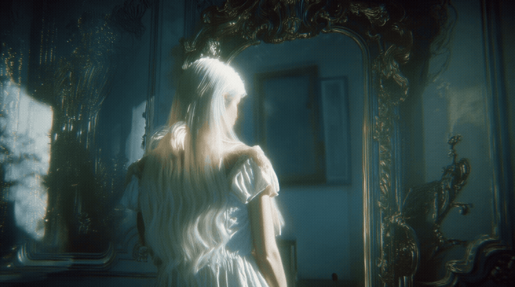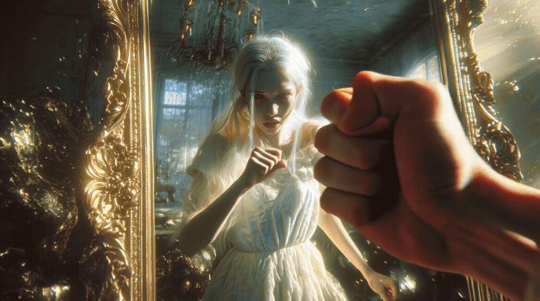 Prompt: Side view of a girl with long straight white hair, center-parted, black eyes, wearing a flowing white long nightgown. She stands on the left side of the frame, raising her fist and swinging a powerful punch toward a vintage ornate full-length mirror on the right side. Her posture is dynamic and full of tension, captured mid-motion.