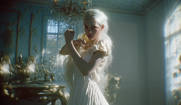Environment: A luxurious white European-style room, surreal and dreamlike